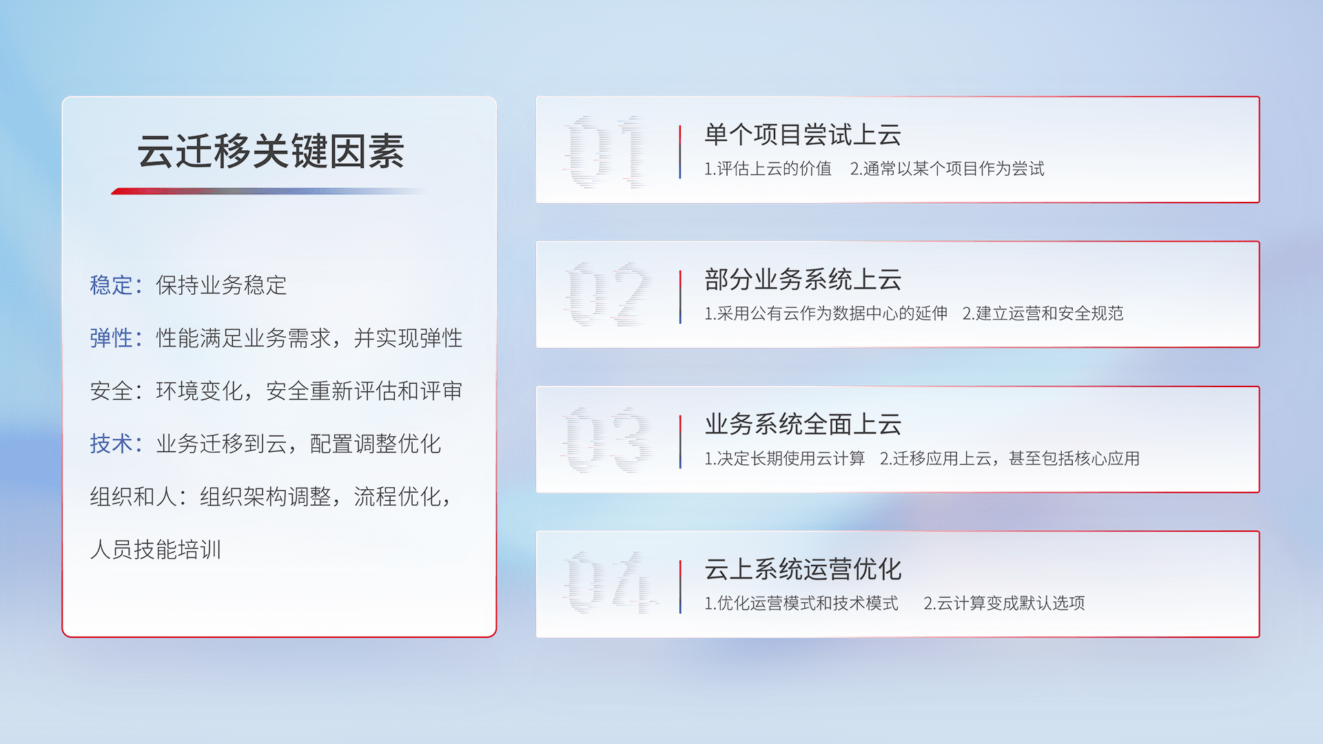 结合实际业务,,,,从规划设计、、、云平台选型、、、、云原生改造、、、、数据迁移、、、集成交付,,迁移全过程为客户识别最佳上云路径,,,,做好风险识别管理,,,,设计网络架构、、身份权限、、、、安全审计合规、、、、操作审计、、、日志审计、、、监控告警策略、、多站点容灾设计等,,对云上基础设施进行整体规划,,提升IT治理水平,,以满足弹性、、、、高可用、、、、高性能的需求。。。