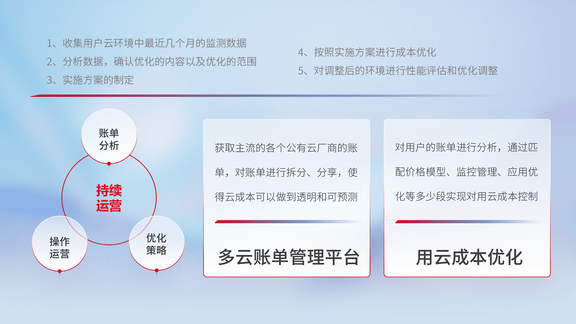 通过多云纳管,,,,以统一的资源数据模型把客户的云资源进行抽象和封装,,,,进而实现对多云资源的统一操作,,,,保障云资源管理的可靠性、、、稳定性与可用性。。。。量身定制化运维内容,,,,配置、、开发运维、、、、补丁管理、、、备份、、、、监控、、、、认证和访问管理、、审计和日常巡检等,,保障在用云过程中的可靠度,,稳定度以及高可用率。。